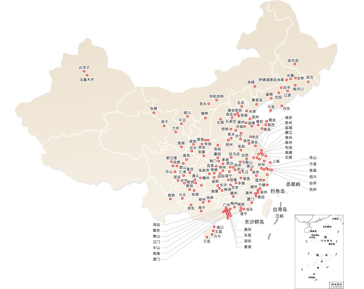 在华东,含上海、浙江省会杭州、江苏省会南京、福建省会福州在内,共进入宁波、绍兴、慈溪、台州、温州、金华、舟山(浙江省);苏州、无锡、常州、南通、扬州、镇江、徐州、盐城、淮安、泰州、句容(江苏省);厦门、泉州、漳州、宁德、莆田(福建省)等城市;